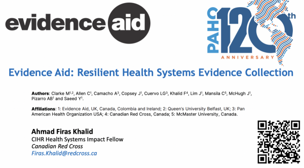 On 11 May 2023, Ahmad Firas Khalid, on behalf of Evidence Aid and the Pan American Health Organization (PAHO), presented, “Advancing Knowledge Translations to Contribute to Resilience in Emergency Preparednes